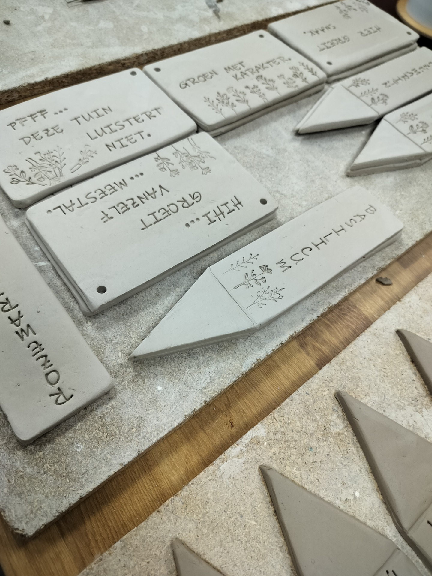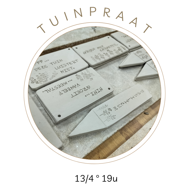In het eerste deel van de workshop ga je aan de slag met klei. Je maakt een tuinquote met een tekst die bij jouw tuin past en stempelt vier kruidenplaatjes met de naam van je favoriete tuinkruiden. Er is volop ruimte om je eigen creatieve ideeën toe te voegen, zodat elk stuk een persoonlijk karakter krijgt.