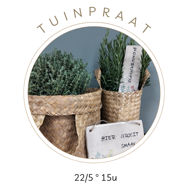 In het eerste deel van de workshop ga je aan de slag met klei. Je maakt een tuinquote met een tekst die bij jouw tuin past en stempelt twee kruidenplaatjes met de naam van je favoriete tuinkruiden. Er is volop ruimte om je eigen creatieve ideeën toe te voegen, zodat elk stuk een persoonlijk karakter krijgt.